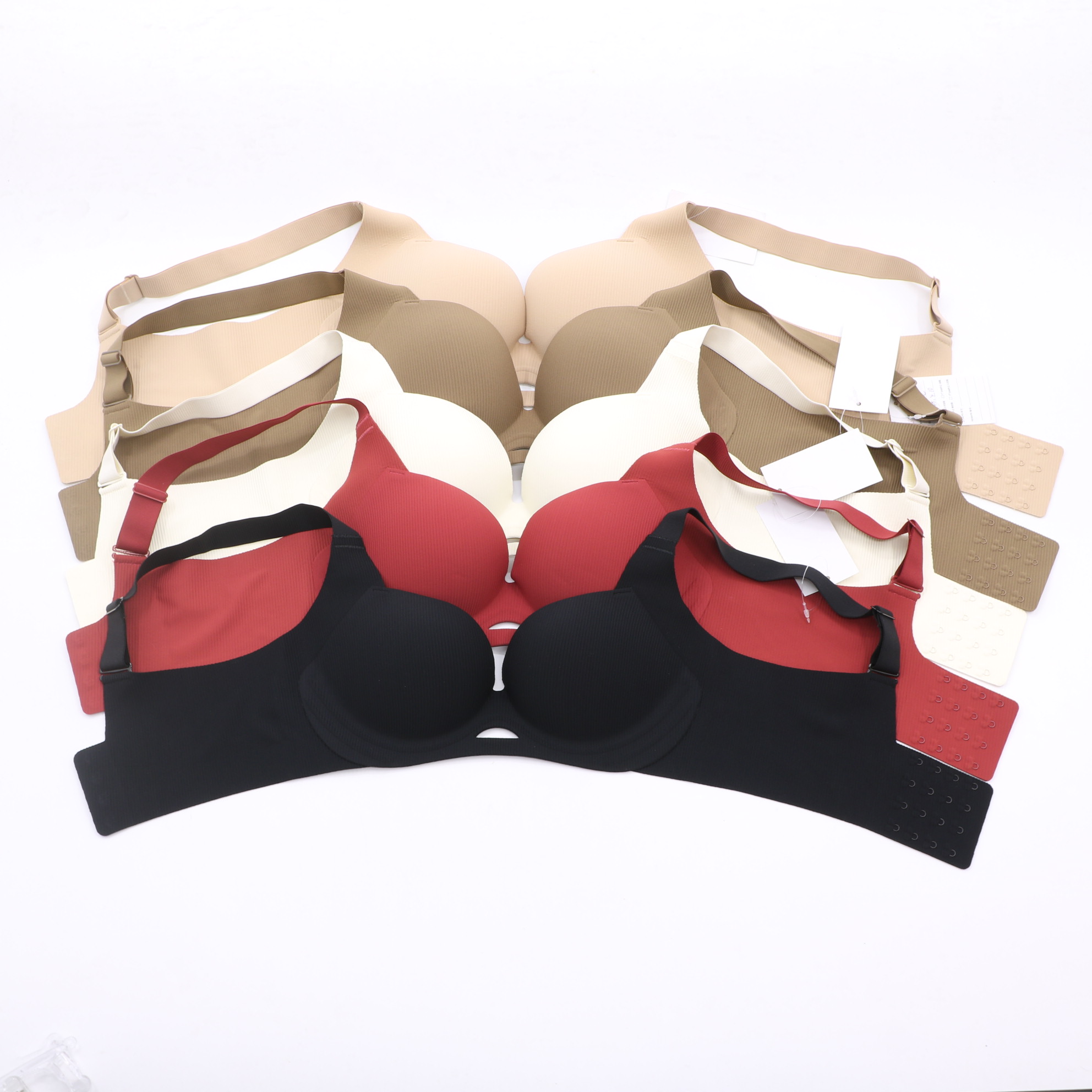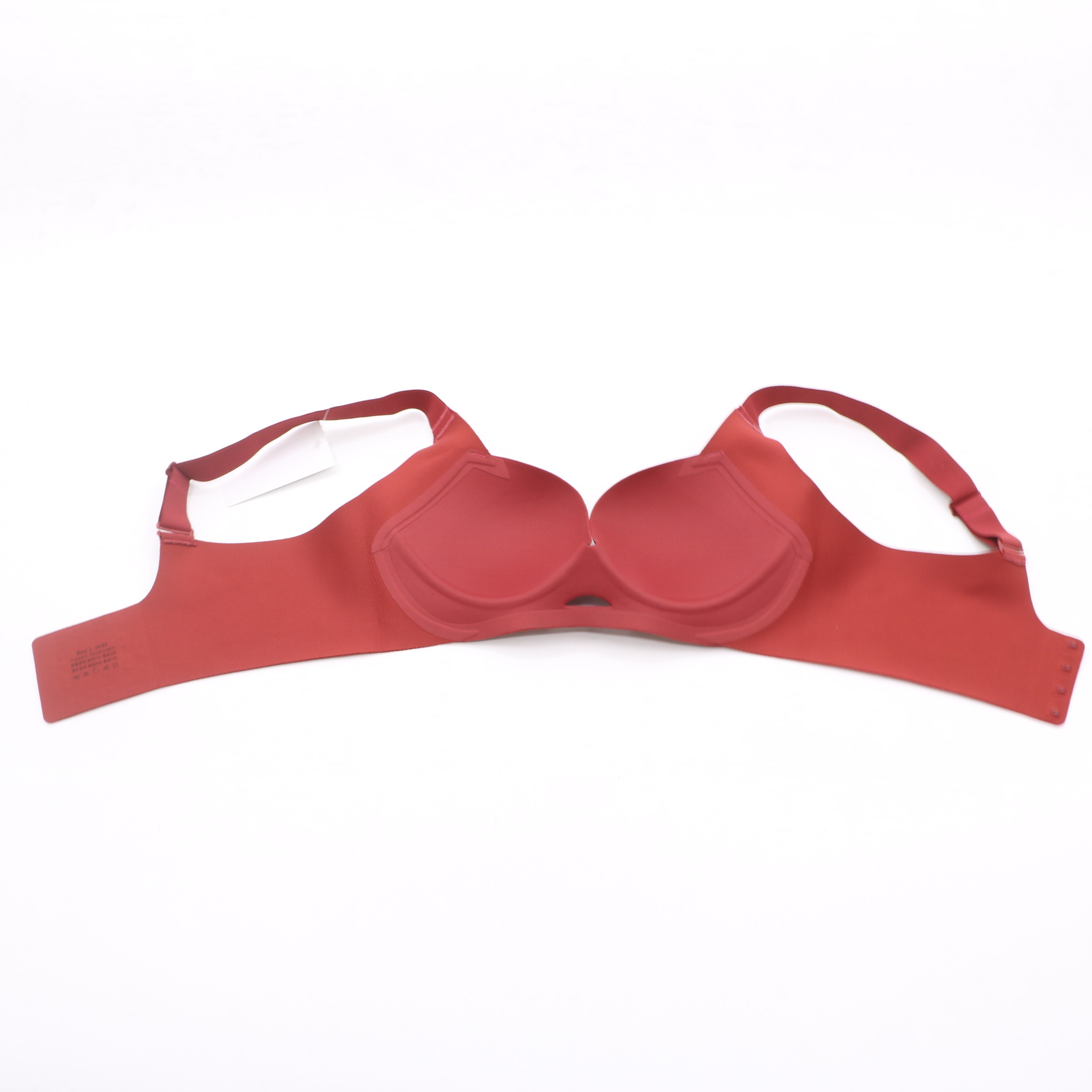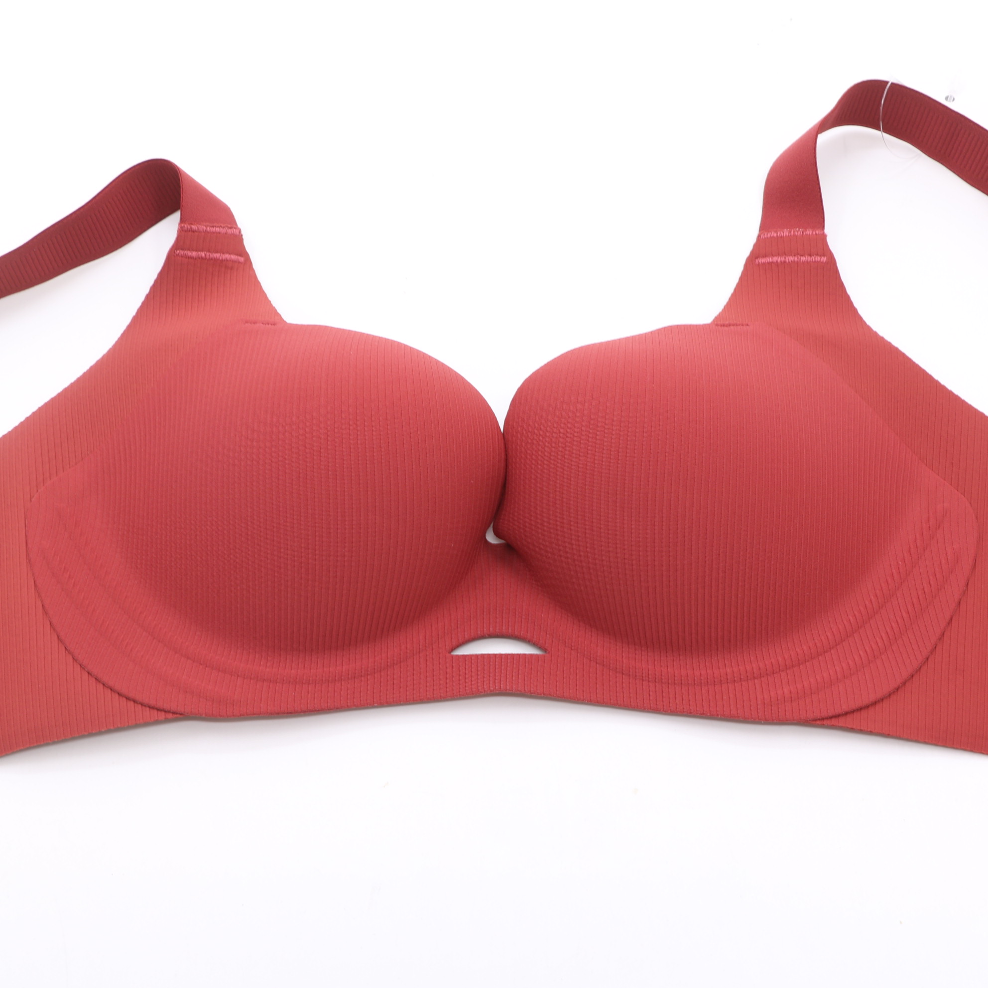 This seamless plunge bra features a ribbed texture, molded cups, and a center keyhole cutout. It has adjustable straps and a multi-row hook-and-eye closure for a secure fit, available in multiple colors for versatile styling.