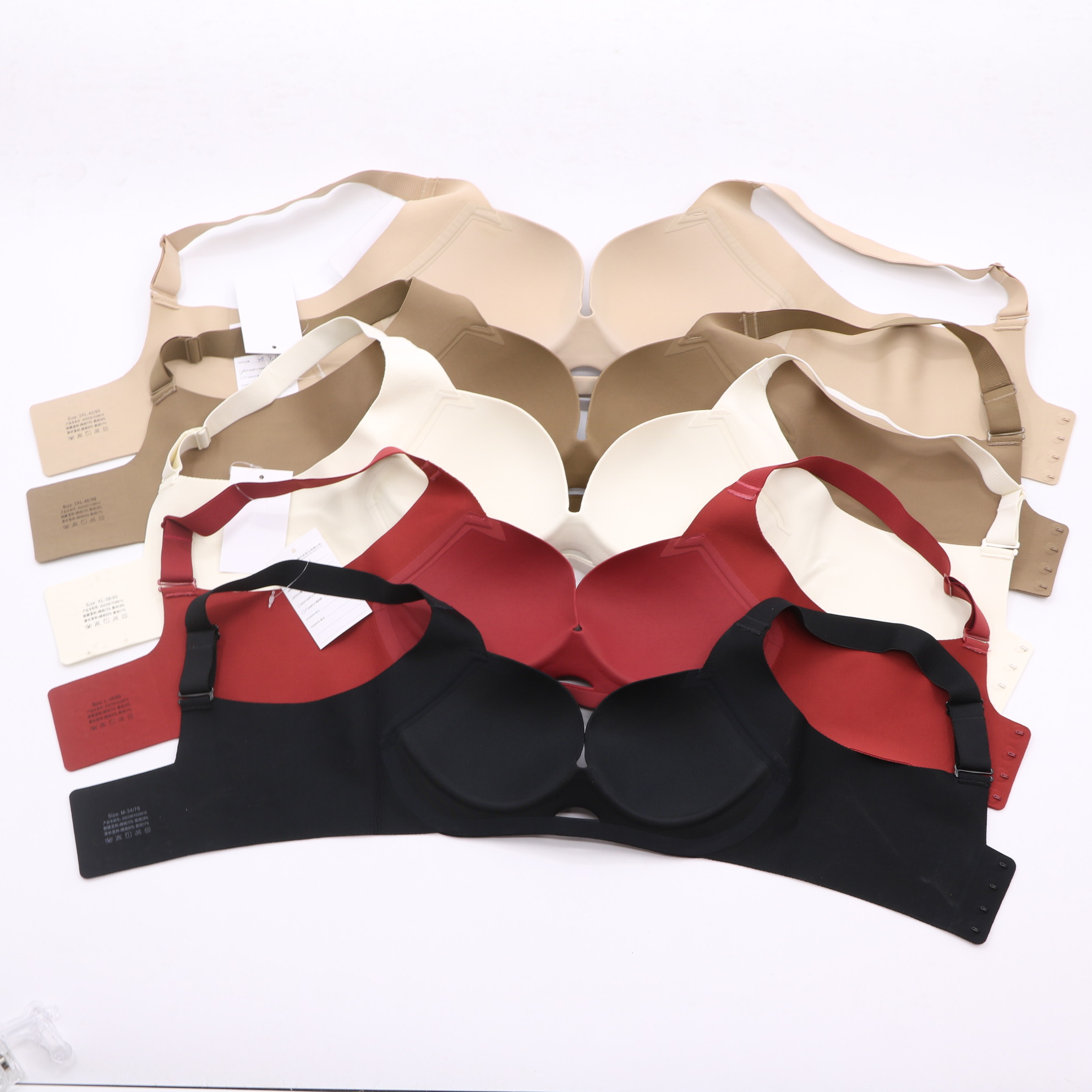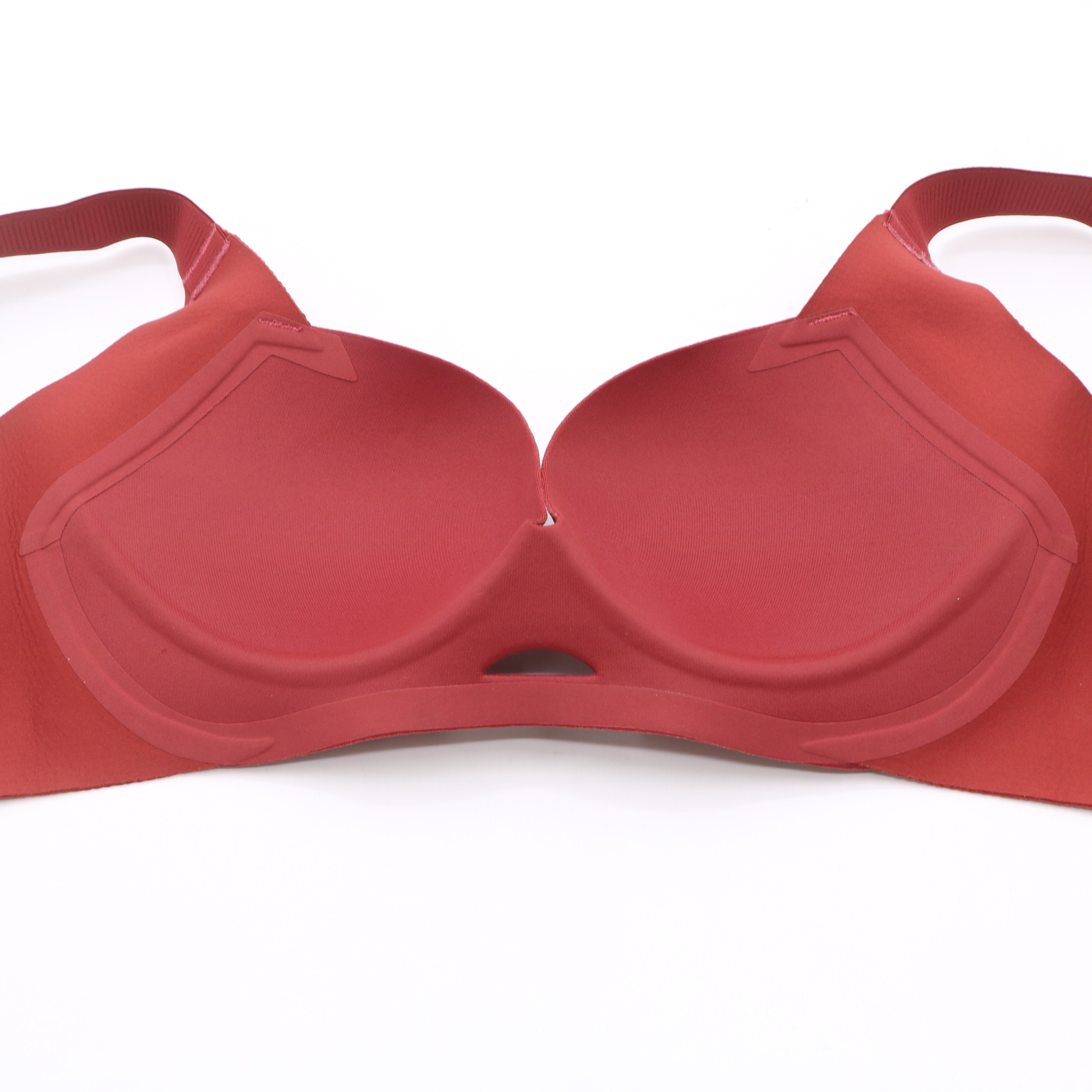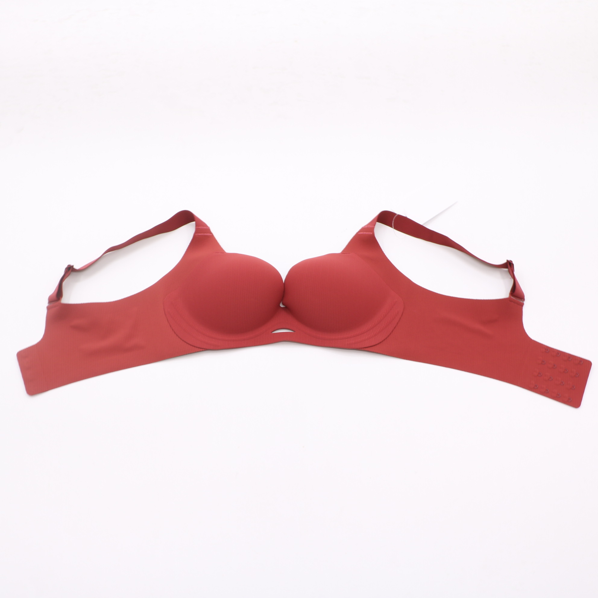 This seamless plunge bra features a ribbed texture, molded cups, and a center keyhole cutout. It has adjustable straps and a multi-row hook-and-eye closure for a secure fit, available in multiple colors for versatile styling.