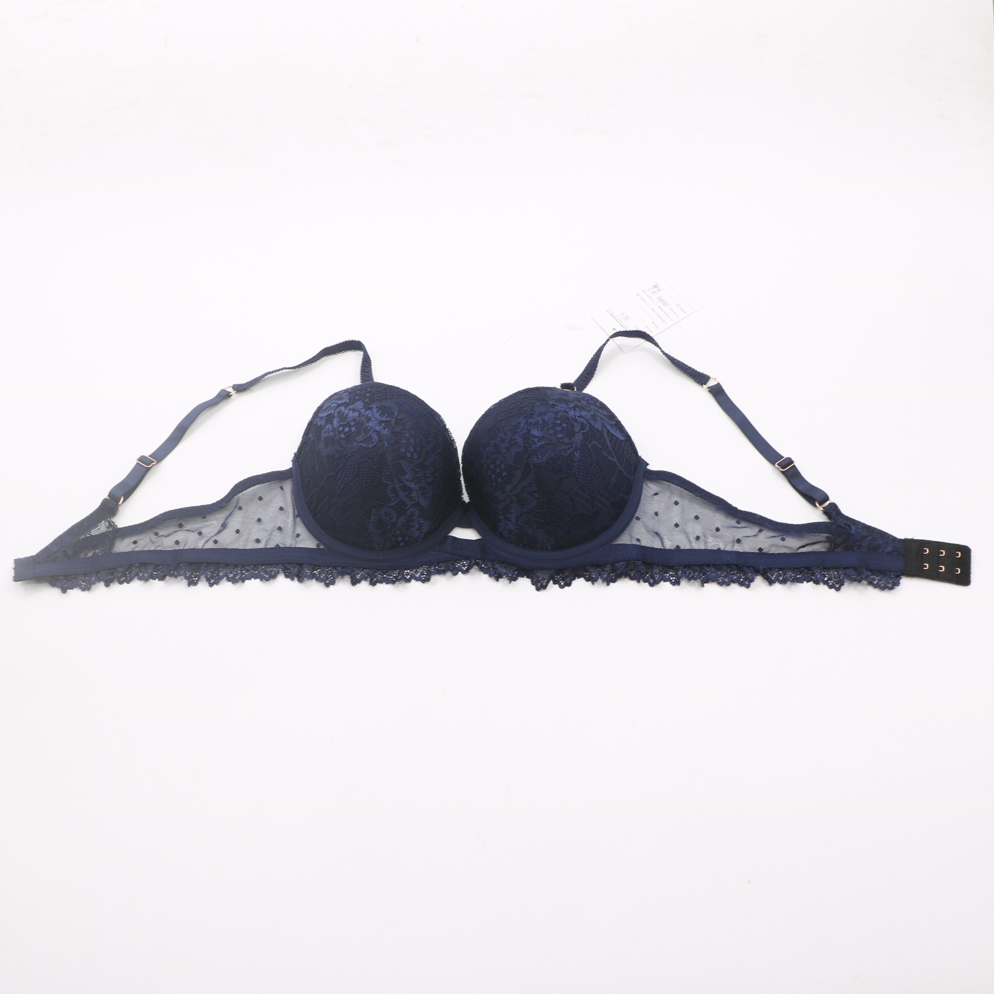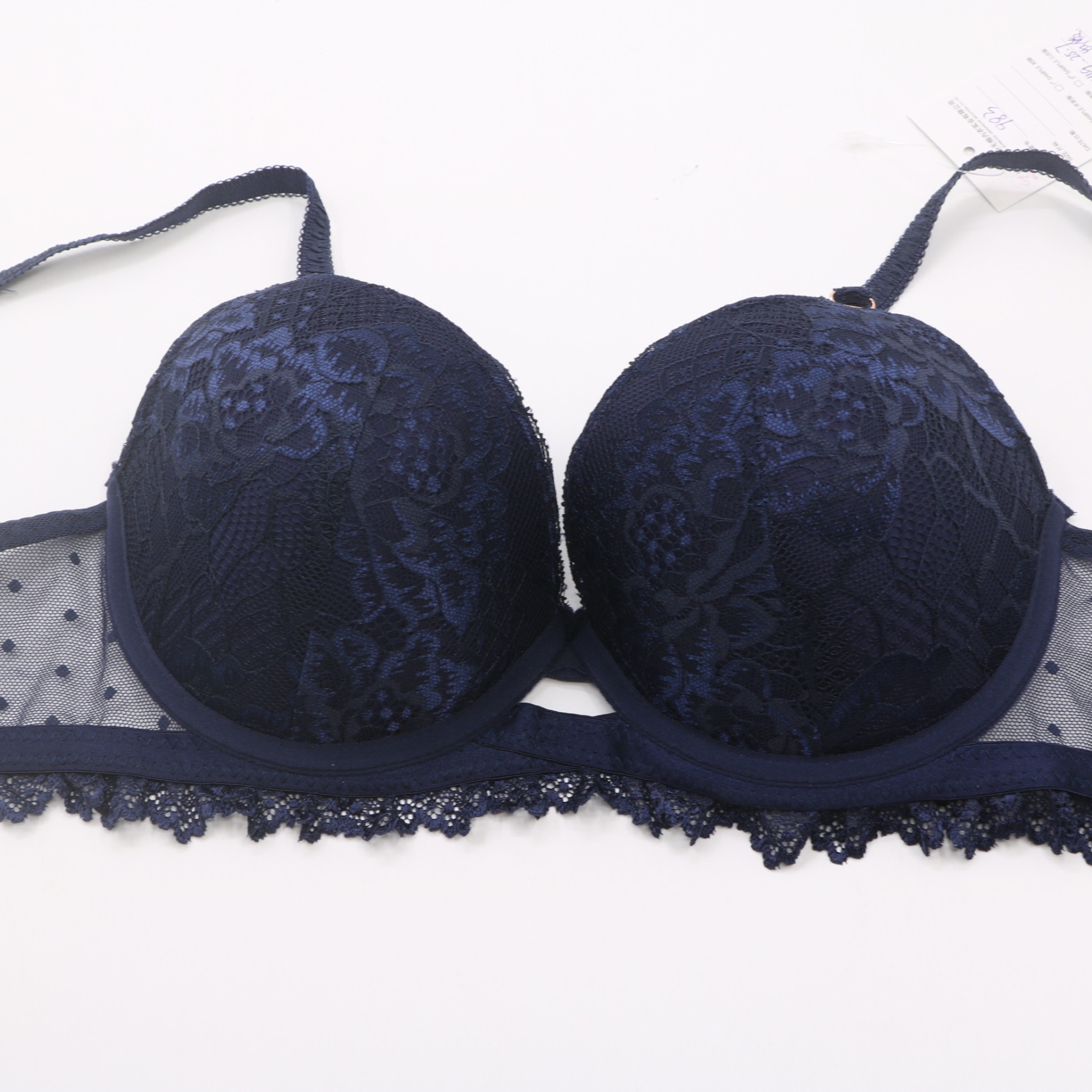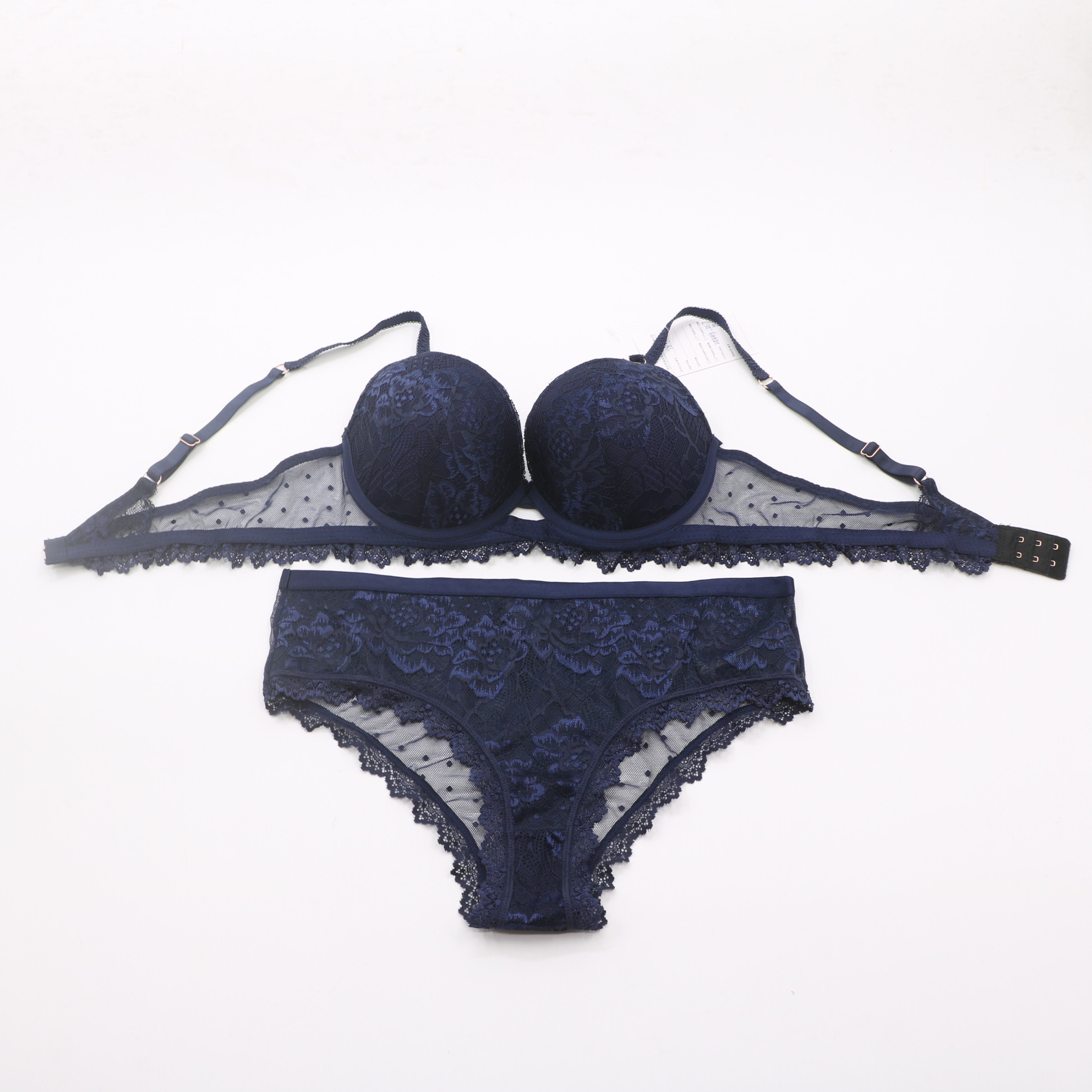 This navy blue lace set is the ultimate in feminine elegance. The sheer dotted mesh and intricate floral lace create a sophisticated look, while the secure closure and adjustable straps ensure all-day comfort