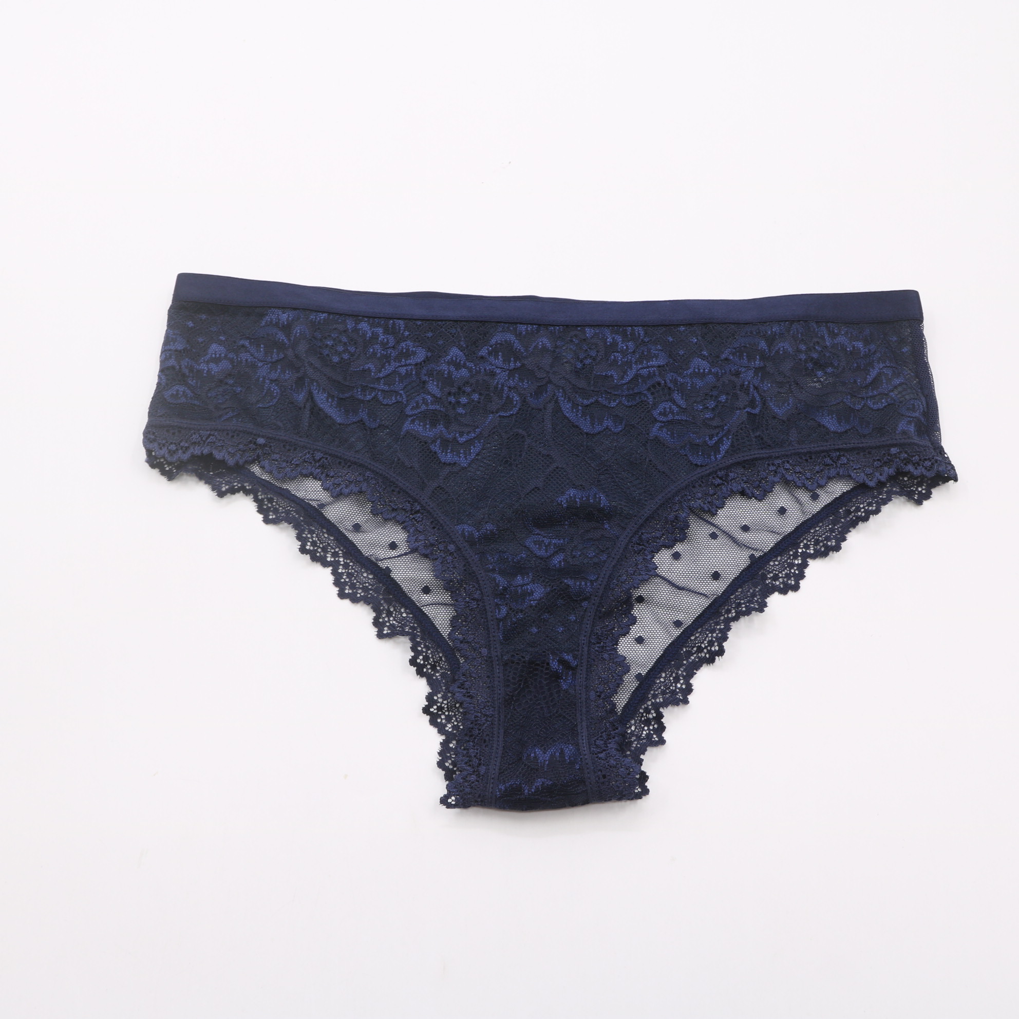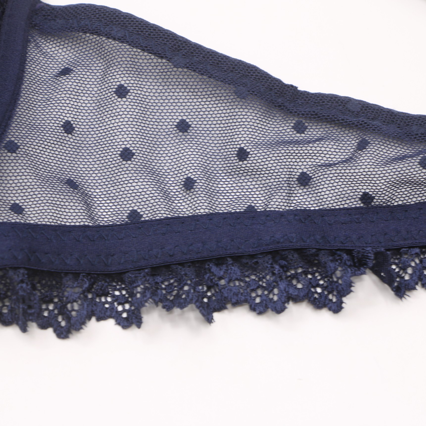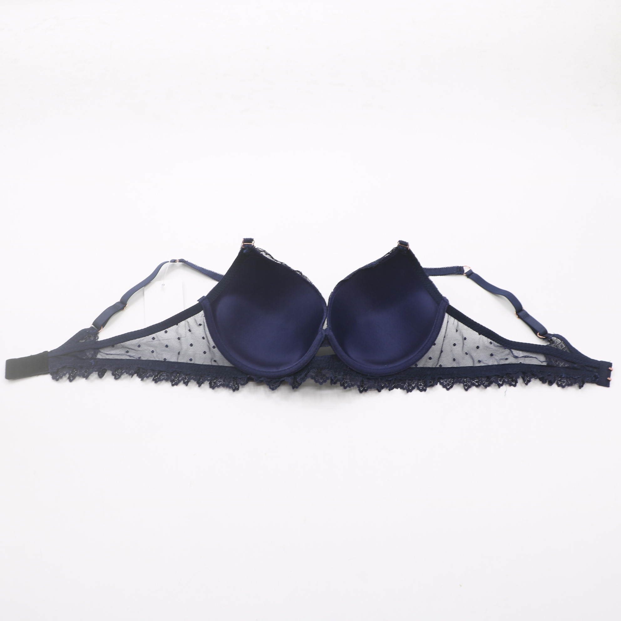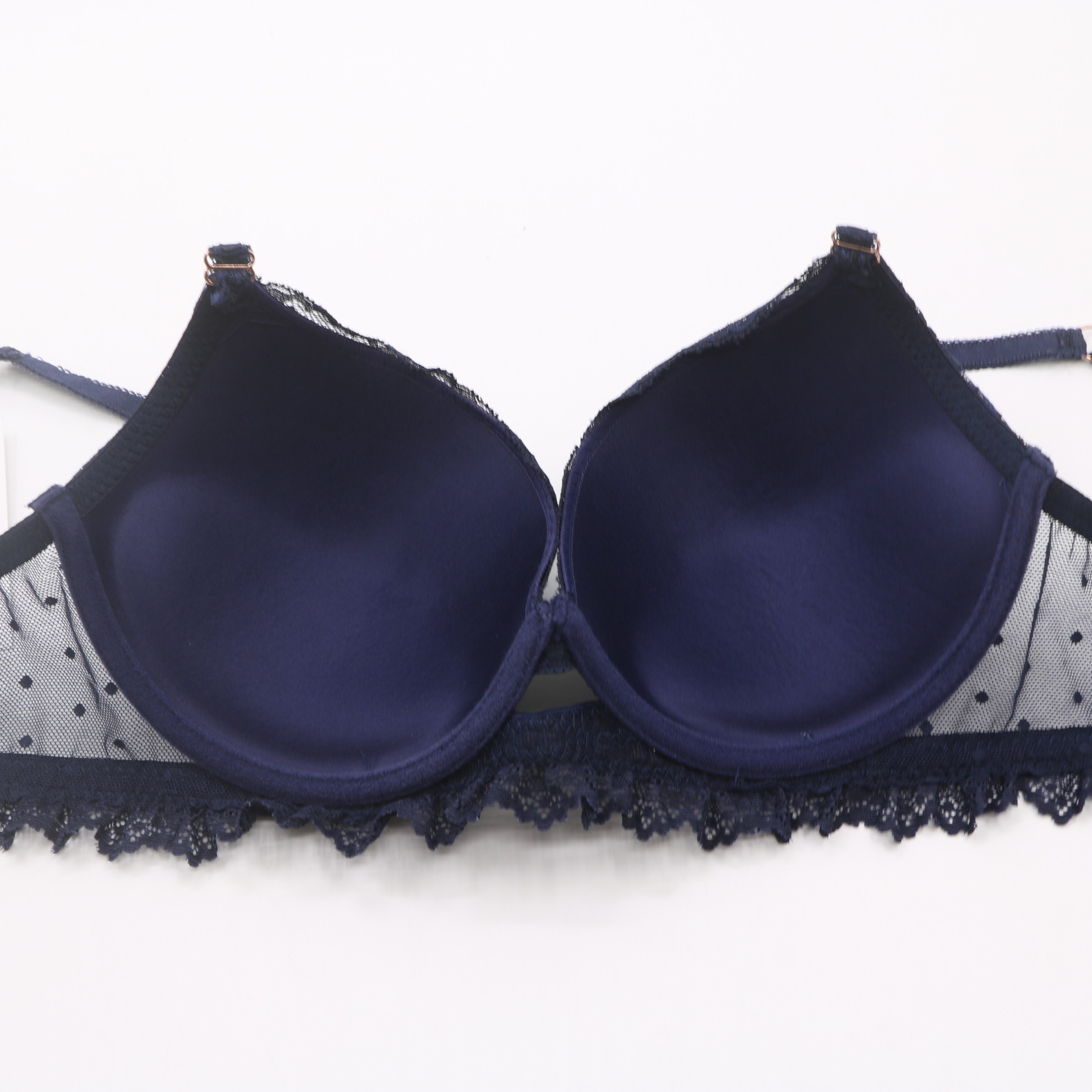 This navy blue lace set is the ultimate in feminine elegance. The sheer dotted mesh and intricate floral lace create a sophisticated look, while the secure closure and adjustable straps ensure all-day comfort